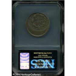 1853 1C --Struck 25% Off Center--VF Details, Damaged, <B>1853 1C --Struck 25% Off Center--VF Details, Damaged, NCS.</B></I> N-10, R.1. Struck off center toward 5 o'clock, just enough of the top of the 3 in the date remains to confirm the date. The 8 is widely recut within the upper loop, which identifies the Newcomb variety. A dig behind the neck and four pinscratches in the field near the forehead constitute the damage. <BR><BR><B>Important notice:</B> Heritage usually auctions material at the rate of 200-250 lots per hour. On some occasions eBay Live bid software or the Internet may not be able to keep up with the pace of the auction. We recommend placing a realistic absentee bid now as insurance to avoid disappointment. Occasionally the auctioneer may eliminate or reject an eBay Live bid, and the auctioneer may also reopen a lot after the close of the eBay live bidding (usually because we missed an audience bid), and may reject your bid even if it shows you as the winning bidder. By bidding via eBay Live, you agree that Heritage may award the lot to another bidder at its sole discretion under the circumstances described above or any other reasonable circumstances. Since eBay bids are not shown to us until we open the lot on the floor, we treat those bids just like floor bids. In most cases the floor responds before the eBay bid is presented to us, due to Internet lag time, so for consistency we have made it a policy that floor bids are always considered first over tie eBay live bids. Also please note that all Heritage lots purchased through eBay Live carry a 20% Buyer's Premium. Please make sure you read the Terms and Conditions before you bid. This lot is being auctioned in conjunction with a live floor auction by Heritage Galleries & Auctioneers. All final auction and invoice information will be supplied by Heritage Galleries & Auctioneers, and all other information should be considered preliminary. Lot:5051