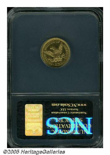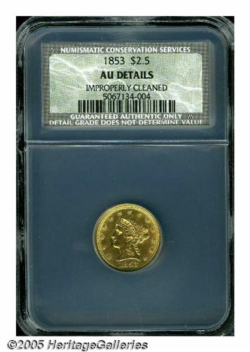 <B>1853<$2 1/2> AU Details, Improperly Cleaned, NCS.</B></I> Bright yellow-gold surfaces display luster in the protected areas, and some wispy hairlines and minute contact marks over each side. The design features are well defined, though the hair above Liberty's ear is weak. Overall, a nice looking piece, despite the light cleaning.