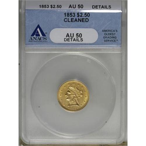<B>1853 $2 1/2 --Cleaned--ANACS. AU50 Details.</B></I> NGC Census: (9/925). PCGS Population (37/608). Mintage: 1,404,668. Numismedia Wsl. Price for NGC/PCGS coin in AU50: $203. (#7767)<BR><BR><B>Coin Engraver:</B> Christian Gobrecht<BR><BR><b>Shipping:</b> Coins & Currency (<a target="_blank" href="http://www.heritageauctions.com/common/shipping.php">view shipping information</a>)