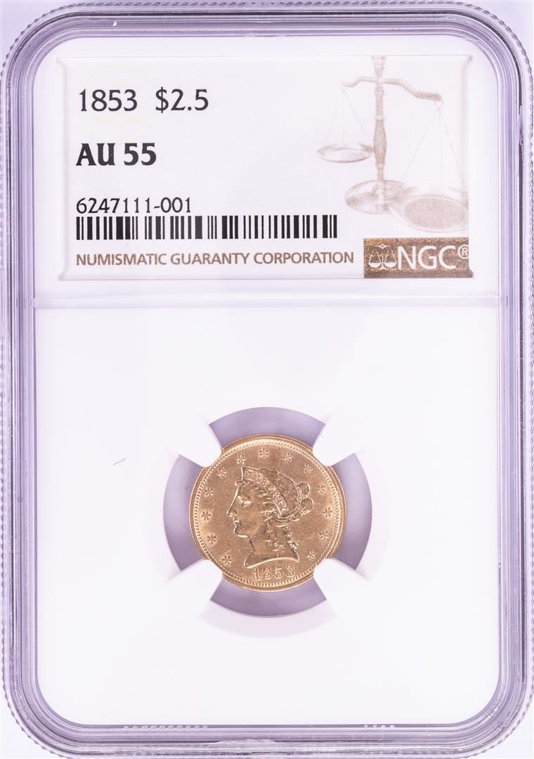 One 1853 $2 1/2 Liberty Head Quarter Eagle Gold Coin NGC AU55. NGC Certified.