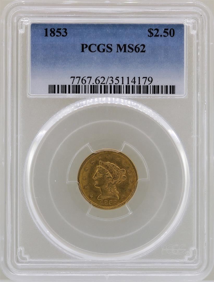 One 1853 $2 1/2 Liberty Head Quarter Eagle Gold Coin PCGS MS62. PCGS Graded.