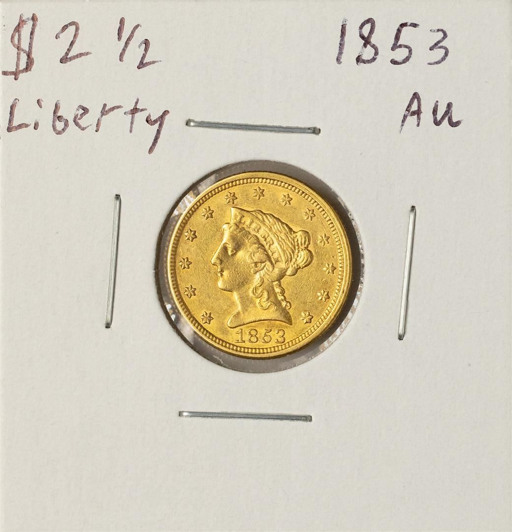 One 1853 $2 1/2 Liberty Head Quarter Eagle Gold Coin.