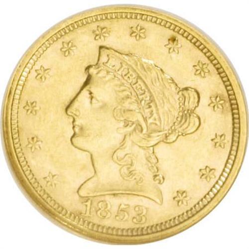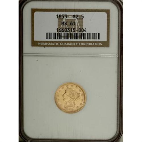 <B>1853 $2 1/2 MS61 NGC.</B></I> NGC Census: (187/439). PCGS Population (53/317). Mintage: 1,404,668. Numismedia Wsl. Price for NGC/PCGS coin in MS61: $412. (#7767)<BR><BR><B>Coin Engraver:</B> Christian Gobrecht<BR><BR><b>Shipping:</b> Coins & Currency (<a target="_blank" href="http://www.heritageauctions.com/common/shipping.php">view shipping information</a>)