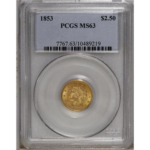 1853 $2 1/2 MS63 PCGS. A solidly struck example that h