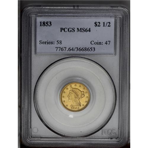<B>1853<$2 1/2> MS64 PCGS.</B></I> This coin is well struck and possesses very attractive green-gold satin surfaces. Despite a small mark on the lower portion of the 5 in the date, and slightly weak luster on the reverse, it is still a very appealing example of this pre-Civil War issue. A small hoard of this date was discovered by Tennessee construction workers in 1987. This is the most common date of the '50s as a result. Population: 50 in 64, 5 finer (3/06). <BR><BR><B>Important notice:</B> Heritage usually auctions material at the rate of 200-250 lots per hour. On some occasions eBay Live bid software or the Internet may not be able to keep up with the pace of the auction. We recommend placing a realistic absentee bid now as insurance to avoid disappointment. Occasionally the auctioneer may eliminate or reject an eBay Live bid, and the auctioneer may also reopen a lot after the close of the eBay live bidding (usually because we missed an audience bid), and may reject your bid even if it shows you as the winning bidder. By bidding via eBay Live, you agree that Heritage may award the lot to another bidder at its sole discretion under the circumstances described above or any other reasonable circumstances. Since eBay bids are not shown to us until we open the lot on the floor, we treat those bids just like floor bids. In most cases the floor responds before the eBay bid is presented to us, due to Internet lag time, so for consistency we have made it a policy that floor bids are always considered first over tie eBay live bids. Also please note that all Heritage lots purchased through eBay Live carry a 20% Buyer's Premium. Please make sure you read the Terms and Conditions before you bid. This lot is being auctioned in conjunction with a live floor auction by Heritage Galleries & Auctioneers. All final auction and invoice information will be supplied by Heritage Galleries & Auctioneers, and all other information should be considered preliminary. Lot:2392 <BR><BR><B>Winning Notification and Billing:</B> After the FINAL session in this auction is complete, Heritage will send e-mail and snail mail invoices. This process normally takes several days. All final auction and invoice information will be supplied by Heritage Galleries & Auctioneers, and all other information should be considered preliminary. <BR><BR>This auction will be conducted on a live auction floor and over the Internet through eBay Live. If you choose to place an absentee bid, please take a moment to <font color='#0000ff'><u><a href='http://pages.ebay.com/liveauctions/help/before/laabsentee.html'>learn how eBay Live absentee bidding works</a></u></font><font color='#000000'>