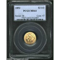 <TABLE cellSpacing=0 cellPadding=0 width="100%" bgColor=#000000 border=0><TBODY><TR><TD width="100%"><TABLE cellSpacing=1 cellPadding=3 width="100%" border=0><TBODY><TR><TD width="100%" bgColor=#79735c><FONT face=arial color=#ffffff size=3><B>Description</B> </FONT></TD></TR><TR><TD width="100%" bgColor=#ffffff><FONT face=arial size=2><B>1853 $2 1/2 MS64 PCGS.</B></I> A clean-cheeked near-Gem with pleasing luster. The bright lemon-gold color contributes further to the eye appeal. The obverse is well struck, while the nearly pristine reverse is a little weak at the center, the grade limiting factor. Population: 40 in 64, 4 finer (8/03). </FONT></TD></TR></TBODY></TABLE></TD></TR></TBODY></TABLE><BR><A name=PricesRealized></A><TABLE cellSpacing=0 cellPadding=0 width="100%" bgColor=#000000 border=0><TBODY><TR><TD width="100%"><TABLE cellSpacing=1 cellPadding=3 width="100%" border=0><TBODY><TR><TD width="100%" bgColor=#79735c><A name=PR><FONT face=arial color=#ffffff size=3><B>Previous Prices from Heritage Auctions</B> </FONT></A></TD></TR><TR><TD bgColor=#f6f6ed><TABLE cellSpacing=0 cellPadding=0 width="100%" border=1><TBODY><TR><TD align=middle width="33%"><B>Date</B></TD><TD align=middle width="33%"><B>Service</B></TD><TD align=middle width="33%"><B>Price</B></TD></TR><TR bgColor=whitesmoke><TD width="33%"><B>08/07/2000</B></TD><TD width="33%">PCGS</TD><TD width="33%">$1,840.00</TD></TR><TR bgColor=whitesmoke><TD width="33%"><B>02/01/2000</B></TD><TD width="33%">PCGS</TD><TD width="33%">$2,300.00</TD></TR><TR bgColor=whitesmoke><TD width="33%"><B>01/01/1990</B></TD><TD width="33%">PCGS</TD><TD width="33%">$2,860.00</TD></TR><TR bgColor=whitesmoke><TD width="33%"><B>11/25/2002</B></TD><TD width="33%">NGC</TD><TD width="33%">$1,322.50</TD></TR><TR bgColor=whitesmoke><TD width="33%"><B>08/17/1996</B></TD><TD width="33%">NGC</TD><TD width="33%">$1,925.00</TD></TR></TBODY></TABLE></TD></TR><TR><TD bgColor=#ffffff><FONT face=arial size=1 ?>PLEASE NOTE: All prices realized reflect the final hammer price PLUS the buyer's premium in auctions that charge a buyer's premium. Each item has a notation at the top of the listing indicating whether that lot included a buyer's premium. Example: A item that sells with a final hammer price of $100 and a 20% buyer's premium will display with a price realized of $120. All information listed is intended to be as accurate as possible, but errors are possible. Please use this guide carefully and inform us of any inaccuracies. </FONT></TD></TR></TBODY></TABLE></TD></TR></TBODY></TABLE><BR><TABLE cellSpacing=0 cellPadding=0 width="100%" bgColor=#000000 border=0><TBODY><TR><TD width="100%"><TABLE cellSpacing=1 cellPadding=3 width="100%" border=0><TBODY><TR><TD width="100%" bgColor=#79735c colSpan=6><FONT face=arial color=#ffffff size=3><B>Price Guide*</B> </FONT></TD></TR><TR bgColor=#f6f6ed><TD align=middle><B>Grade</B> </TD><TD align=middle><B>Coin World<BR>(Trends)</B> </TD><TD align=middle><B>Numismedia<BR>Retail</B> </TD><TD align=middle><B>Numismedia<BR>Wholesale</B> </TD><TD align=middle><B>Coin<BR>Universe</B> </TD><TD align=middle><B>Heritage<BR>Value Index</B> </TD></TR><TR bgColor=#ffffff><TD align=middle>63</TD><TD align=right>$1,800.00</TD><TD align=right>---</TD><TD align=right>$1,200.00</TD><TD align=right>$1,450.00</TD><TD align=right>$988.00</TD></TR><TR style="FONT-WEIGHT: bold" bgColor=#cccfdd><TD align=middle>64</TD><TD align=right>---</TD><TD align=right>---</TD><TD align=right>$1,950.00</TD><TD align=right>$2,875.00</TD><TD align=right>$1,617.50</TD></TR><TR bgColor=#ffffff><TD align=middle>65</TD><TD align=right>---</TD><TD align=right>---</TD><TD align=right>$4,650.00</TD><TD align=right>---</TD><TD align=right>$1,635.00</TD></TR><TR bgColor=#ffffff><TD colSpan=6><FONT size=1>*All information listed is intended to be as accurate as possible, but errors are possible. No item may be returned or refused based on this information which is provided as a service to our customers. You should contact each pricing source directly to determine the accuracy of this information. </FONT></TD></TR></TBODY></TABLE></TD></TR></TBODY></TABLE><BR><TABLE cellSpacing=0 cellPadding=0 width="100%" bgColor=#000000 border=0><TBODY><TR><TD width="100%"><TABLE cellSpacing=1 cellPadding=3 width="100%" border=0><TBODY><TR><TD width="100%" bgColor=#79735c><FONT face=arial color=#ffffff size=3><B>Population Guide</B> </FONT></TD></TR><TR bgColor=#ffffff><TD align=middle><!-- Begin Output of Population Grid--><TABLE cellSpacing=0 cellPadding=0 width="100%" border=0><TBODY><TR><TD vAlign=center><TABLE cellSpacing=0 width="100%" border=1 cellsadding="3"><TBODY><TR><TD vAlign=center><TABLE cellSpacing=0 cellPadding=3 width="100%" border=1><TBODY><TR><TD vAlign=center align=middle bgColor=#f0f1e8 colSpan=2 <CENTER><FONT face=Arial size=2><B>PCGS Pop </B></FONT><CENTER></CENTER></TD><TD vAlign=center align=middle bgColor=#f0f1e8 colSpan=2><CENTER><FONT face=Arial size=2><B>NGC Pop</B></CENTER></FONT></TD></TR><TR><TD vAlign=center><FONT face=Arial size=2>(64)</FONT> </TD><TD vAlign=center align=right><FONT face=Arial size=2>40</FONT> </TD><TD vAlign=center><FONT face=Arial size=2>(64)</FONT> </TD><TD vAlign=center align=right><FONT face=Arial size=2>45</FONT> </TD></TR><TR><TD vAlign=center><FONT face=Arial size=2>(>64)</FONT> </TD><TD vAlign=center align=right><FONT face=Arial size=2>4</FONT> </TD><TD vAlign=center><FONT face=Arial size=2>(>64)</FONT> </TD><TD vAlign=center align=right><FONT face=Arial size=2>7</FONT> </TD></TR></TBODY></TABLE></TD></TR></TBODY></TABLE></TD></TR></TBODY></TABLE><!-- End Output of Population Grid--> Important notice: Heritage usually auctions material at the rate of 200-250 lots per hour. On some occasions eBay Live bid software or the Internet may not be able to keep up with the pace of the auction. We recommend placing a realistic absentee bid now as insurance to avoid disappointment. Occasionally the auctioneer may eliminate or reject an eBa
