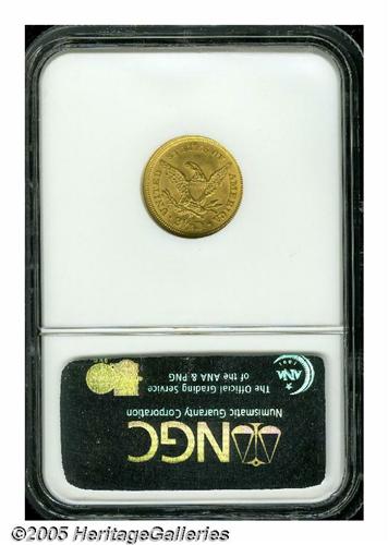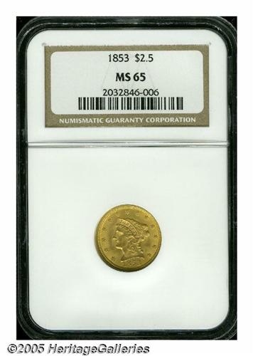 <B>1853<$2 1/2> MS65 NGC.</B></I> Frosty and attractive, with just a hint of pale olive-gold iridescence. Most design features are sharp save for the letter B in LIBERTY, the eagle's right thigh (viewer's left) and left claw, which show a touch of striking softness as made. Readily available in the MS60 to 63 grade range due to the existence of a hoard, but as with so many other issues in the 19th-century U.S. gold series, only a small coterie of Uncirculated survivors can claim membership in the MS65 category, a claim that is attested by NGC population data. Population: 10 in 65, 0 finer (5/05).<BR><I>From the Dr. Kurt Peters Collection.</B></I> From the Dr. Kurt Peters Collection.