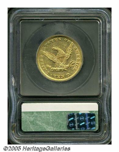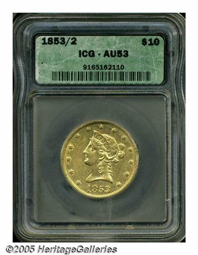 <B>1853/2<$10> AU53 ICG.</B></I> FS-007. Two curved lines are visible within the lower loop of the 3 in the date, and the tip of the underlying 2 extends to just left of the lower ball of the 3. Lightly marked for the grade and type, this straw-gold representative has no shortage of bright luster throughout the stars, shield, and legends. Nicely struck except for the stars, which are indifferently struck.