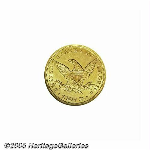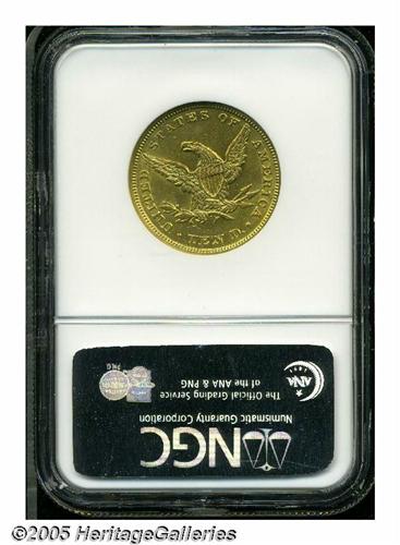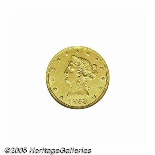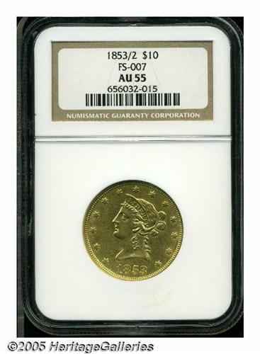 <B>1853/2<$10> AU55 NGC.</B></I> FS-007. Examination with a glass reveals the lower portion of the neck of the 2 in the lower loop of the 3 as well as the point of 2 just left of the ball of the 3. A bit weakly struck, the surfaces are bright and show a bit of lemon-gold patina with a number of small abrasions scattered over each side.