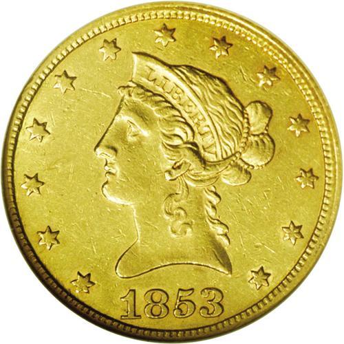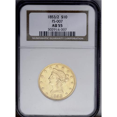 1853/2 $10 AU55 NGC. FS-007. Two curved lines are obvi 1853/2[$10] AU55 NGC.