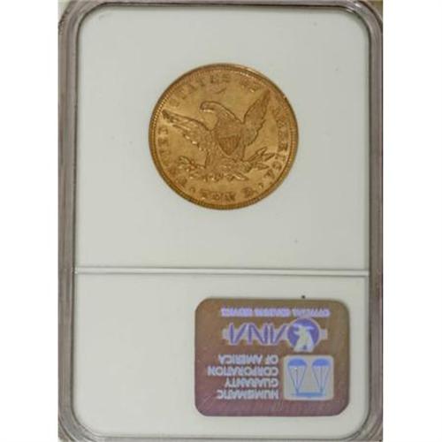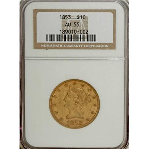 <B>1853/2 $10 AU55 NGC.</B></I> FS-301, formerly FS-007. The overdate is undesignated on the NGC insert, but the date location and the lines and lower left tip of the underdigit 2 confirm the variety. An original example with the luster extent of a higher grade, but there are two noticeable marks, beneath Liberty's chin and near the eagle's beak.<BR><BR><B>Coin Engraver:</B> Christian Gobrecht<BR><BR><b>Shipping:</b> Coins & Currency (<a target="_blank" href="http://www.heritageauctions.com/common/shipping.php">view shipping information</a>)