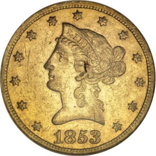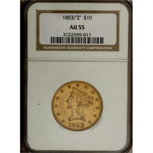 <B>1853/2 $10 AU55 NGC.</B></I> FS-301, formerly FS-007. Discovered in 1960, this overdate was once considered rare. Through the years enough have be cherrypicked from dealer inventories to qualify this issue as scarce today. However, this issue is a condition rarity in Mint State grades and finding an attractive Almost Uncirculated piece can be a challenge. The current coin affords bidders in this sale the opportunity to acquire a nice, original example with lustrous surfaces. Two marks by star 4 are the only distractions worthy of mention. Census: 37 in 55, 22 finer (12/07).<BR><I>From The John Stimson, Sr. Collection, Part One.</B></I><BR><BR><B>Coin Engraver:</B> Christian Gobrecht<BR><BR><b>Shipping:</b> Coins & Currency (<a target="_blank" href="http://www.heritageauctions.com/common/shipping.php">view shipping information</a>)