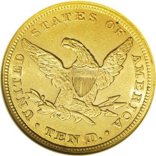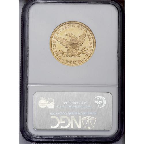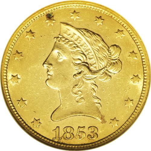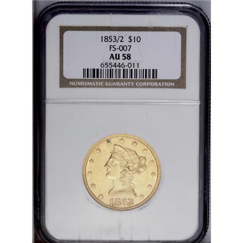 <B>1853/2<$10> AU58 NGC.</B></I> FS-007. Examination with a glass reveals the lower portion of the neck of the 2 in the lower loop of the 3 as well as the lower crossbar of the 2 just below the lower edge of 3. A bit weakly struck, the surfaces are bright and show a bit of straw-gold patina with a number of small abrasions scattered over each side. The only undisputed overdate variety in the Liberty eagle series. Census: 15 in 58, 1 finer (7/06).