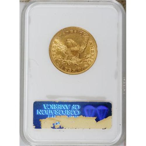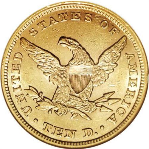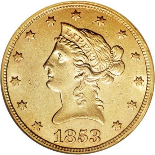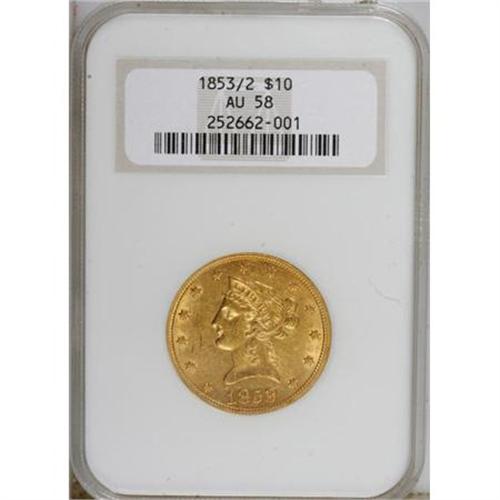 <B>1853/2 $10 AU58 NGC.</B></I> To date, NGC and PCGS have certified 171 1853/2 overdates, ranging from Very Fine to MS62; only two Mint State pieces have been graded. High-end AU coins have been inflated by resubmissions. Generous luster resides on the peach-gold surfaces of this AU58 specimen, that also boasts sharp design definition. A few marks scattered about are consistent with the grade.<BR><BR><B>Coin Engraver:</B> Christian Gobrecht<BR><BR><b>Shipping:</b> Coins & Currency (<a target="_blank" href="http://www.heritageauctions.com/common/shipping.php">view shipping information</a>\)