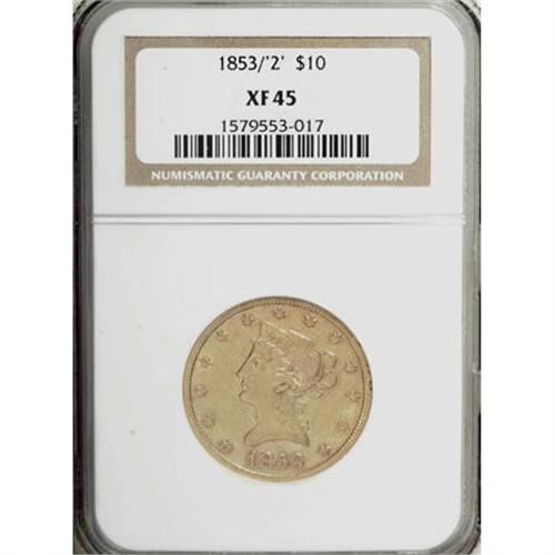 <B>1853/2 $10 XF45 NGC.</B></I> FS-301, formerly FS-007. The lower curve of the underdigit 2 is apparent within the lower loop of the 3, and there is even a tiny spike from the lower corner of the 2 left of the lower ball of the 3. Luster is plentiful for the grade, but this slightly bright example has a mark on the shield and another above the bust tip.<BR><BR><B>Coin Engraver:</B> Christian Gobrecht<BR><BR><b>Shipping:</b> Coins & Currency (<a target="_blank" href="http://www.heritageauctions.com/common/shipping.php">view shipping information</a>)