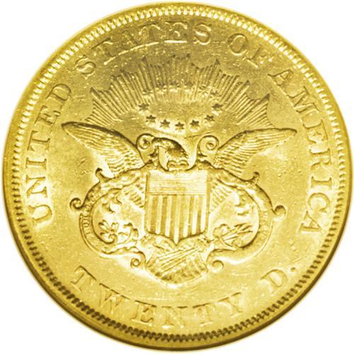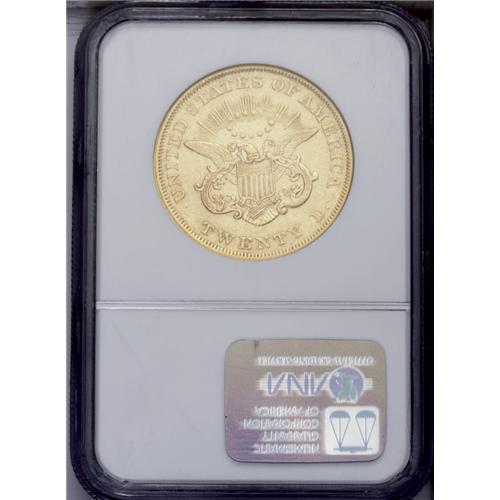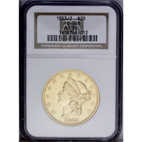 <B>1853/2<$20> AU50 NGC.</B></I> FS-301, formerly FS-008. A lightly circulated example of this scarce overdate. The outline of the lower curve of the 2 is clear within the 3 in the date. The right-side obverse stars are soft, but the overall strike is crisp. A bit glossy, but the only relevant bagmark is located on the cheek.
