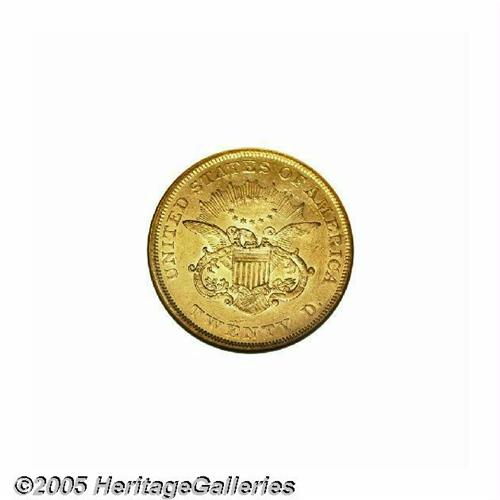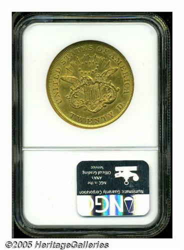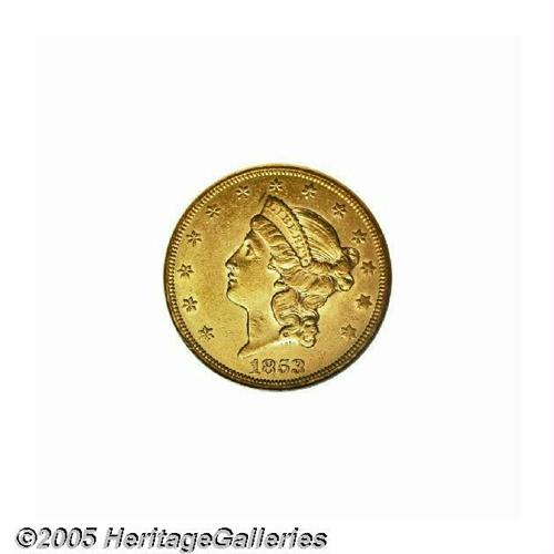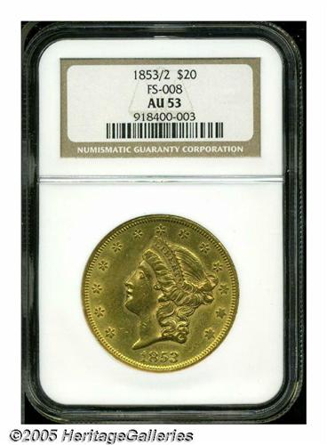<B>1853/2<$20> AU53 NGC.</B></I> FS-008. An uncommonly high grade representative of this conditionally scarce overdate double eagle, both sides are tinged in orange-gold color. The frosty textured surfaces show a typical number of abrasions so commonly encountered, but those that are present are mostly small in size. Well balanced in terms of striking quality with a bold overall appearance and a clear underdigit. Very pleasing overall. Population: 17 in 53, 34 finer (6/05).