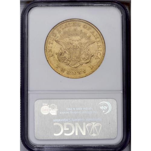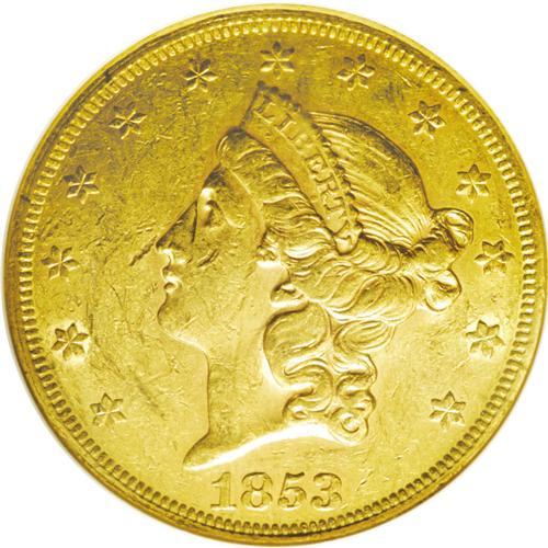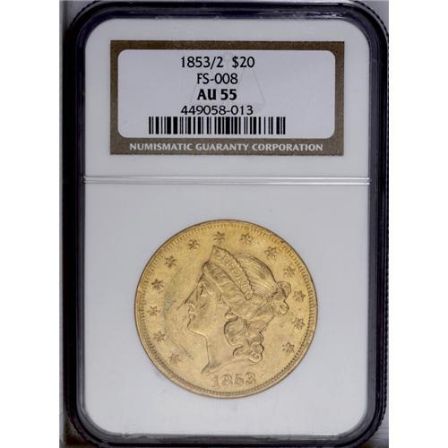 <B>1853/2<$20> AU55 NGC.</B></I> FS-008. The overdate shows nicely under magnification. Lightly worn with scattered marks, including some abrasions in prime focal areas. Honey-gold with pale green accents on the obverse and amber on the reverse with nearly full luster. Well struck and important. Census: 20 in 55, 24 finer (7/06).