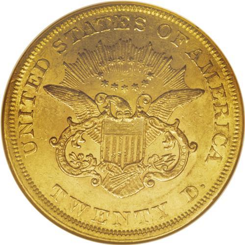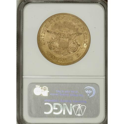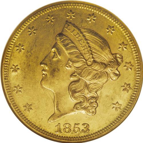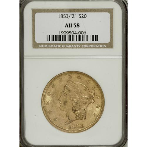 <B>1853/2 $20 AU58 NGC.</B></I> FS-301, formerly FS-008. The remnants of a 2 are visible inside the lower curve of the 3 in the date, and a diagnostic lump (probably a rust spot on the die) is located beneath the R of LIBERTY. Jeff Garrett and Ron Guth (2006) note that the variety was discovered in the 1950s, and that examples were found on the <I>S.S. Central America</B></I> and <I>S.S. Republic,</B></I> some of which were in high grade. Mint State pieces are hard to come by, as evidenced by fewer than 10 specimens having been certified by NGC and PCGS.<BR> The AU58 example that we offer in this lot retains ample luster on the peach-gold surfaces that are tinted with light tan. Excellent motif definition has been imparted by a well executed strike. The usual number of bagmarks and luster grazes are visible on both sides.<BR><BR><b>Shipping:</b> Coins & Currency (<a target="_blank" href="http://www.heritageauctions.com/common/shipping.php">view shipping information</a>)