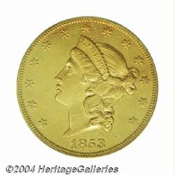 <table><tbody><tr><td><table> <TR><TD width="100%"><TABLE cellSpacing=1 cellPadding=3 width="100%" border=0><TBODY><TR><TD width="100%" bgColor=#79735c><FONT face=arial color=#ffffff size=3><B>Description</B> </FONT></TD></TR><TR><TD width="100%" bgColor=#ffffff><FONT face=arial size=2><B>1853/2 $20 AU55 PCGS.</B></I> The 1853 overdate is one of the premier rarities among Philadelphia Mint double eagles. It is an absolute as well as a condition rarity with very few accounted for in AU grades and currently only four Uncirculated coins certified. The downstroke of the 2 in the lower loop of the 3 is pronounced on this piece and one only needs light magnification to see it. The surfaces are quite clean overall with the only noticeable abrasions being in the lower left obverse field and in the lower reverse field above TWENTY. Well struck, the surfaces are slightly hazy and orange-gold in color.<BR><I>From a Magnificent Collection of Double Eagles.</B></I> </FONT></TD></TR></TBODY></TABLE></TD></TR></TBODY></TABLE><BR><A name=PricesRealized></A><TABLE cellSpacing=0 cellPadding=0 width="100%" bgColor=#000000 border=0><TBODY><TR><TD width="100%"><TABLE cellSpacing=1 cellPadding=3 width="100%" border=0><TBODY><TR><TD width="100%" bgColor=#79735c><A name=PR><FONT face=arial color=#ffffff size=3><B>Previous Prices from Heritage Auctions</B> </FONT></A></TD></TR><TR><TD bgColor=#f6f6ed><TABLE cellSpacing=0 cellPadding=0 width="100%" border=1><TBODY><TR><TD align=middle width="33%"><B>Date</B></TD><TD align=middle width="33%"><B>Service</B></TD><TD align=middle width="33%"><B>Price</B></TD></TR><TR bgColor=whitesmoke><TD width="33%"><B>04/27/2002</B></TD><TD width="33%">ANACS</TD><TD width="33%">$9,200.00</TD></TR><TR bgColor=whitesmoke><TD width="33%"><B>10/06/2001</B></TD><TD width="33%">PCGS</TD><TD width="33%">$6,612.50</TD></TR></TBODY></TABLE></TD></TR><TR><TD bgColor=#ffffff><FONT face=arial size=1 ?>PLEASE NOTE: All prices realized reflect the final hammer price PLUS the buyer's premium in auctions that charge a buyer's premium. Each item has a notation at the top of the listing indicating whether that lot included a buyer's premium. Example: A item that sells with a final hammer price of $100 and a 20% buyer's premium will display with a price realized of $120. All information listed is intended to be as accurate as possible, but errors are possible. Please use this guide carefully and inform us of any inaccuracies. </FONT></TD></TR></TBODY></TABLE></TD></TR></TBODY></TABLE><BR><TABLE cellSpacing=0 cellPadding=0 width="100%" bgColor=#000000 border=0><TBODY><TR><TD width="100%"><TABLE cellSpacing=1 cellPadding=3 width="100%" border=0><TBODY><TR><TD width="100%" bgColor=#79735c colSpan=6><FONT face=arial color=#ffffff size=3><B>Price Guide*</B> </FONT></TD></TR><TR bgColor=#f6f6ed><TD align=middle><B>Grade</B> </TD><TD align=middle><B>Coin World<BR>(Trends)</B> </TD><TD align=middle><B>Numismedia<BR>Retail</B> </TD><TD align=middle><B>Numismedia<BR>Wholesale</B> </TD><TD align=middle><B>Coin<BR>Universe</B> </TD><TD align=middle><B>Heritage<BR>Value Index</B> </TD></TR><TR bgColor=#ffffff><TD align=middle>53</TD><TD align=right>---</TD><TD align=right>---</TD><TD align=right>$4,150.00</TD><TD align=right>---</TD><TD align=right>$3,579.33</TD></TR><TR style="FONT-WEIGHT: bold" bgColor=#cccfdd><TD align=middle>55</TD><TD align=right>$6,000.00</TD><TD align=right>---</TD><TD align=right>$4,450.00</TD><TD align=right>$3,700.00</TD><TD align=right>$4,408.33</TD></TR><TR bgColor=#ffffff><TD align=middle>58</TD><TD align=right>$15,000.00</TD><TD align=right>---</TD><TD align=right>$17,500.00</TD><TD align=right>---</TD><TD align=right>$9,750.00</TD></TR><TR bgColor=#ffffff><TD colSpan=6><FONT size=1>*All information listed is intended to be as accurate as possible, but errors are possible. No item may be returned or refused based on this information which is provided as a service to our customers. You should contact each pricing source directly to determine the accuracy of this information. </FONT></TD></TR></TBODY></TABLE></TD></TR></TBODY></TABLE><BR><TABLE cellSpacing=0 cellPadding=0 width="100%" bgColor=#000000 border=0><TBODY><TR><TD width="100%"><TABLE cellSpacing=1 cellPadding=3 width="100%" border=0><TBODY><TR><TD width="100%" bgColor=#79735c><FONT face=arial color=#ffffff size=3><B>Population Guide</B> </FONT></TD></TR><TR bgColor=#ffffff><TD align=middle><!-- Begin Output of Population Grid--><TABLE cellSpacing=0 cellPadding=0 width="100%" border=0><TBODY><TR><TD vAlign=center><TABLE cellSpacing=0 width="100%" border=1 cellsadding="3"><TBODY><TR><TD vAlign=center><TABLE cellSpacing=0 cellPadding=3 width="100%" border=1><TBODY><TR><TD vAlign=center align=middle bgColor=#f0f1e8 colSpan=2 <CENTER><FONT face=Arial size=2><B>PCGS Pop </B></FONT><CENTER></CENTER></TD><TD vAlign=center align=middle bgColor=#f0f1e8 colSpan=2><CENTER><FONT face=Arial size=2><B>NGC Pop</B></CENTER></FONT></TD></TR><TR><TD vAlign=center><FONT face=Arial size=2>(55)</FONT> </TD><TD vAlign=center align=right><FONT face=Arial size=2>9</FONT> </TD><TD vAlign=center><FONT face=Arial size=2>(55)</FONT> </TD><TD vAlign=center align=right><FONT face=Arial size=2>16</FONT> </TD></TR><TR><TD vAlign=center><FONT face=Arial size=2>(>55)</FONT> </TD><TD vAlign=center align=right><FONT face=Arial size=2>7</FONT> </TD><TD vAlign=center><FONT face=Arial size=2>(>55)</FONT> </TD><TD vAlign=center align=right><FONT face=Arial size=2>13</FONT> </TD></TR></TBODY></TABLE></TD></TR></TBODY></TABLE></TD></TR></TBODY></TABLE><!-- End Output of Population Grid--></TD></TR></TBODY></TABLE></TD></TR></TBODY></TABLE><BR><TABLE cellSpacing=0 cellPadding=0 width="100%" bgColor=#000000 border=0><TBODY><TR> <font color='#000000'><span style='background-color: #FFFFFF'><td bgcolor='#FFFFFE'> Important notice: Heritage usually auctions material at the rate of 200-250 lots per hour. On some occasions eBay Live bid software or the Internet may not be 