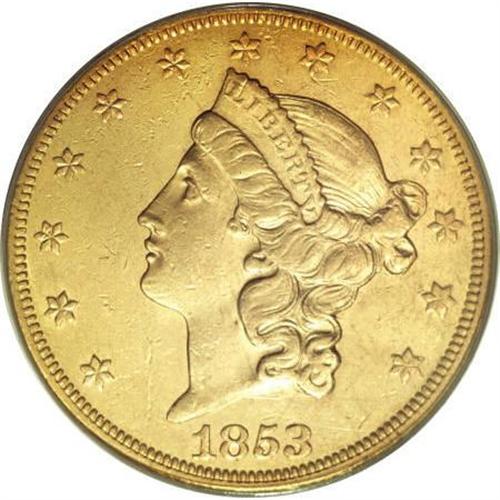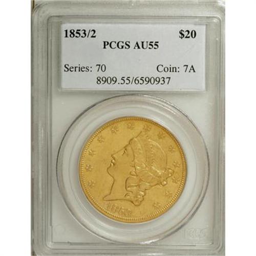 <B>1853/2 $20 AU55 PCGS.</B></I> The 1853/2 overdate is one of the premier rarities among Philadelphia Mint double eagles. It is an absolute as well as a condition rarity, with few accounted for in AU and currently only a handful of Mint State pieces certified. The downstroke of the 2 in the lower loop of the 3 is pronounced on this piece, and one only needs light magnification to see it. The surfaces are quite clean overall, with the only noticeable abrasions in the lower left obverse field and the lower reverse field above TWENTY. The well-struck surfaces are slightly hazy and orange-gold in color. Population: 16 in 55, 19 finer (3/08).<BR><BR><B>Coin Engraver:</B> James B. Longacre<BR><BR><b>Shipping:</b> Coins & Currency (<a target="_blank" href="http://www.heritageauctions.com/common/shipping.php">view shipping information</a>)