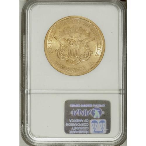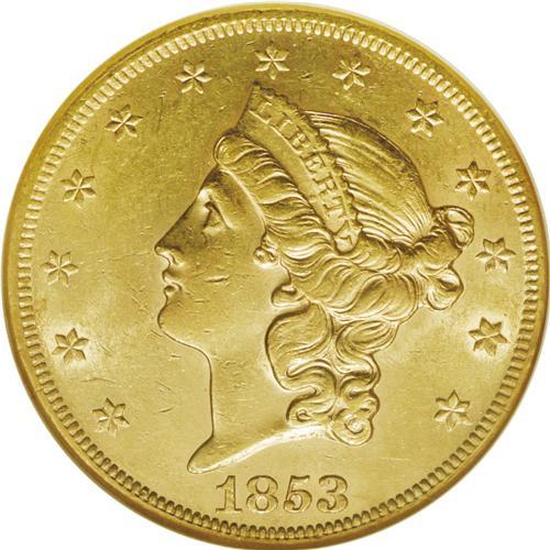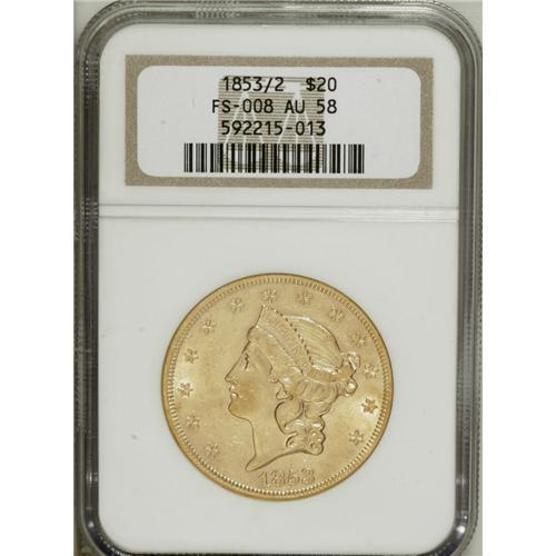 <B>1853/2 $20 AU58 NGC.</B></I> FS-301, formerly FS-008. The remnants of a 2 are visible beneath the 3 in the date and plain under magnification, and a diagnostic raised area (a rusted spot on the die) appears below the R in LIBERTY. Though this variety commands a comparatively modest premium in Very Fine and lower grades, the relative scarcity of overdated examples becomes plain in higher grades, with only eight Mint State pieces graded by NGC and PCGS combined (12/06).<BR> Light highpoint friction keeps this piece from a higher grade, but that makes it an opportunity to acquire a representative with a similar appearance for a considerably lower price. The apricot-gold surfaces have nearly full luster and few marks overall, and the strike is pleasing. Listed on page 254 of the 2007 <I>Guide Book.</B></I><BR><BR><b>Shipping:</b> Coin/Currency (<a target="_blank" href="http://www.heritageauctions.com/common/shipping.php">view shipping information</a>)