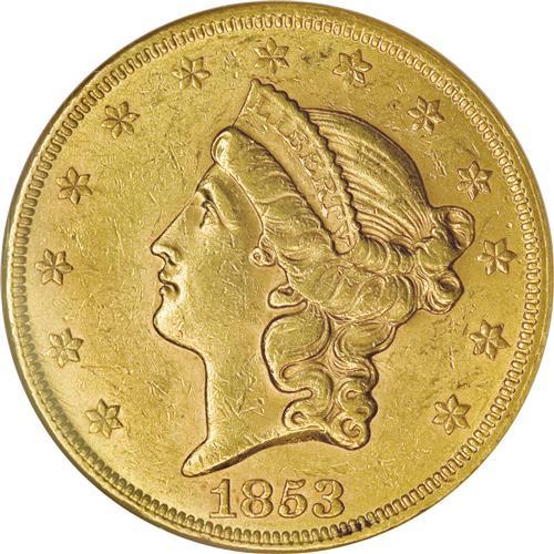 <B>1853/2 $20 AU58 NGC.</B></I> This overdate has been known for quite a number of years, and despite efforts by some to show that it is actually not an overdate variety, it remains an important part of any double eagle collection. This example represents the exact obverse die that has been described as an overdate, with traces of the previous figure inside the lower loop of the digit 3. A small but prominent die chip is positioned on the coronet below the tail of R in LIBERTY. Both sides have nearly full luster with rich yellow and orange gold color. Few finer examples of the overdate have been certified. Census: 29 in 58, 4 finer (4/07).<BR><BR><b>Shipping:</b> Coins & Currency (<a target="_blank" href="http://www.heritageauctions.com/common/shipping.php">view shipping information</a>)