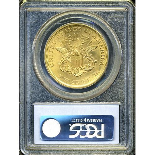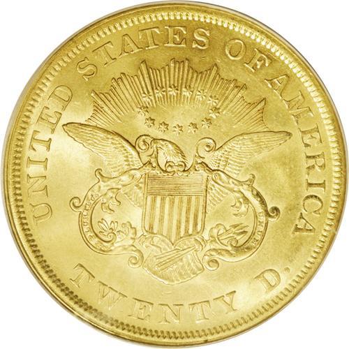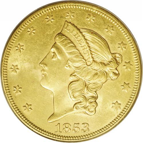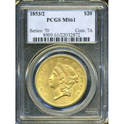 <B>1853/2<$20> MS61 PCGS.</B></I> Breen-7162. See the excellent close-up in Walter Breen's <I>Complete Encyclopedia of United States Coins</B></I> for the details of this overdate. Walter Breen claims discovery of this variety in January 1959, but it was not widely publicized until Ted Clark wrote about it in the January 7, 1981 issue of <I>Coin World.</B></I> The lower part of the diagonal of the previous 2 is visible within the lower opening of the 3. Minute traces of doubling is visible within the 5, but his is from a slightly different shaped 5, which Breen attributed to part of the 1852 logotype. A dull raised lump is visible beneath the R of LIBERTY. Short, nearly vertical file lines are visible at the border outside star 13. A few other file lines slant down to the right from the border near stars 1 and 2. The A of STATES has a broken and partially patched crossbar. All of these characteristics of the earliest die states identify this piece as the truly important overdate variety. This example is fully lustrous and quite well-defined. Slight weakness is visible within the hair on the obverse as almost always for the Type One double eagles. Stars 11, 12, and 13 are similarly weak with only partial central detail. All design elements on the reverse appear to be fully or almost fully defined. The surfaces have frosty yellow luster with a hint of green coloration. This is a splendid example that will delight even the most advanced collector. Population: 4 in 61, 0 finer (1/06).