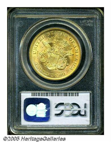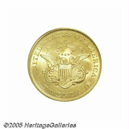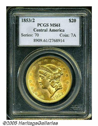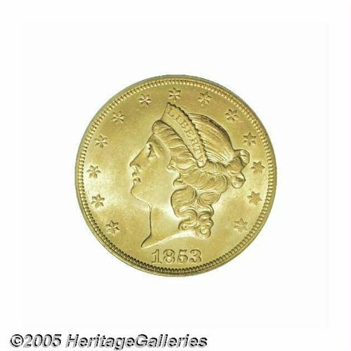 <B>1853/2<$20> MS61 S.S. Central America PCGS.</B></I> The importance of this offering should be immediately apparent to anyone remotely familiar with U.S. gold. We have only seen one other Mint State example of this overdate, an MS62 we offered in our 2004 FUN Signature Sale, the previously finest known was an AU58.<BR> The 1853 overdate is the only overdate that is recognized in the entire Liberty Double Eagle series. It wasn't discovered until 1959 and only began to be widely recognized in the early 1980s. By then, of the coins that were still in existence, a great many had been ravaged by cleaning or were only available in VF-XF condition. This is one of three MS61 examples, and is bettered by the single MS63 (the finest known) at either service. As an interesting aside, there were three overdates in the <I>S.S. Central America</B></I> holdings, two of which were in relatively high grades. This is a well defined piece (save for stars 11, 12, and 13) whose satiny mint luster is interrupted only by the presence of numerous small abrasions scattered over each side. The only mark that stands out as particularly noteworthy is a horizontal abrasion above the TW of TWENTY on the reverse.<BR> All genuine 1853 overdates have the same die characteristics, and it is important to always check that these are present, as repunched dates are also known, and these coins have on occasion been foisted upon the unknowing as genuine overdates. Genuine overdates show clear evidence of the underdigit. There is also a diagnostic die dot below the R of LIBERTY, visible with light magnification. Repunching over a much smaller 1 is also noted near the base of the first digit (only faintly seen on this piece). Also, the crossbar of the A in STATES is broken and shows to have been repaired by hand.<BR> A rare and important opportunity for the specialist.<BR><I>From The Edward O'Neill Collection of Liberty Double Eagles.</B></I>
