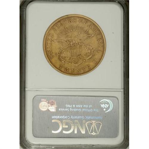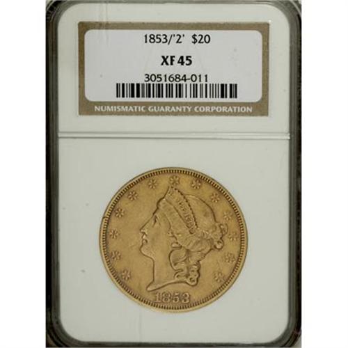 <B>1853/2 $20 XF45 NGC.</B></I> FS-301, formerly FS-008. Two lines of a 2 are visible inside the lower curve of the 3 in the date, and a diagnostic die lump is located beneath the R of LIBERTY. This straw-gold example has a pair of minor rim nicks at 11:30 on the reverse, but there are no other mentionable marks.<BR><BR><B>Coin Engraver:</B> James B. Longacre<BR><BR><b>Shipping:</b> Coins & Currency (<a target="_blank" href="http://www.heritageauctions.com/common/shipping.php">view shipping information</a>)