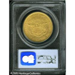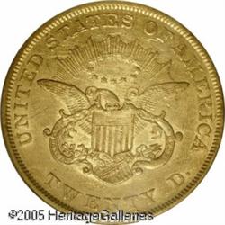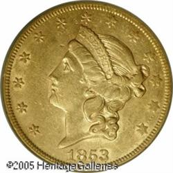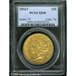 <B>1853/2 $20 XF45 PCGS.</B></I> Breen-7162. An unmistakable example of this elusive overdate. Under light magnification an underdigit and the diagnostic die dot below the RTY of LIBERTY are visible. The Breen <I>Encyclopedia</B></I> shows a very clear photo of the underdigit on page 564. Breen discovered this variety in Jacksonville, Florida in January 1959, but it was not widely recognized until Ted Clark published an article entitled "Will the Real 1853/2 $20 Please Stand Up?" in the January 7, 1981 edition of <I>Coin World.</B></I> The present example displays nice definition on the design elements, though the centers of a couple of stars along the right border are soft. The surfaces are apricot-gold in color, and exhibit luster in portions of the recessed areas. A few light to moderate bagmarks are seen over each side, and an area of pinscratches is seen in the upper left obverse field. Lot:8942