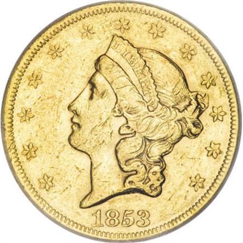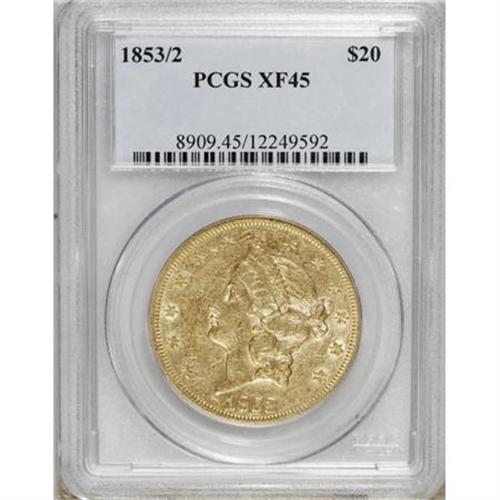 <B>1853/2 $20 XF45 PCGS.</B></I> FS-301, formerly FS-008. Breen-7162. A die lump beneath the R in LIBERTY confirms this rare overdate. The lower curve of a 2 is evident, and is similar in appearance to the underdigit 2 found on the 1853/2 ten dollar variety. Luster is plentiful and consistent with a higher grade, but the obverse is typically abraded. Population: 17 in 45, 57 finer (12/07).<BR><BR><B>Coin Engraver:</B> James B. Longacre<BR><BR><b>Shipping:</b> Coins & Currency (<a target="_blank" href="http://www.heritageauctions.com/common/shipping.php">view shipping information</a>)