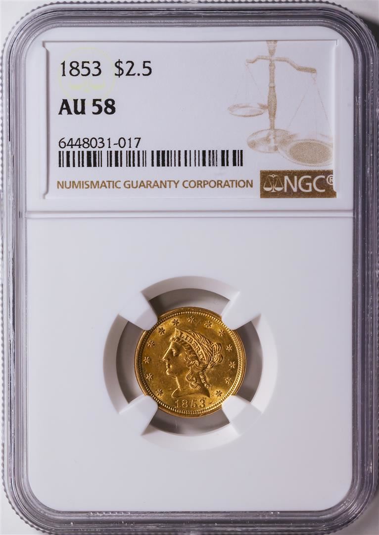 One 1853 $2.5 Liberty Head Quarter Eagle Gold Coin NGC AU58.