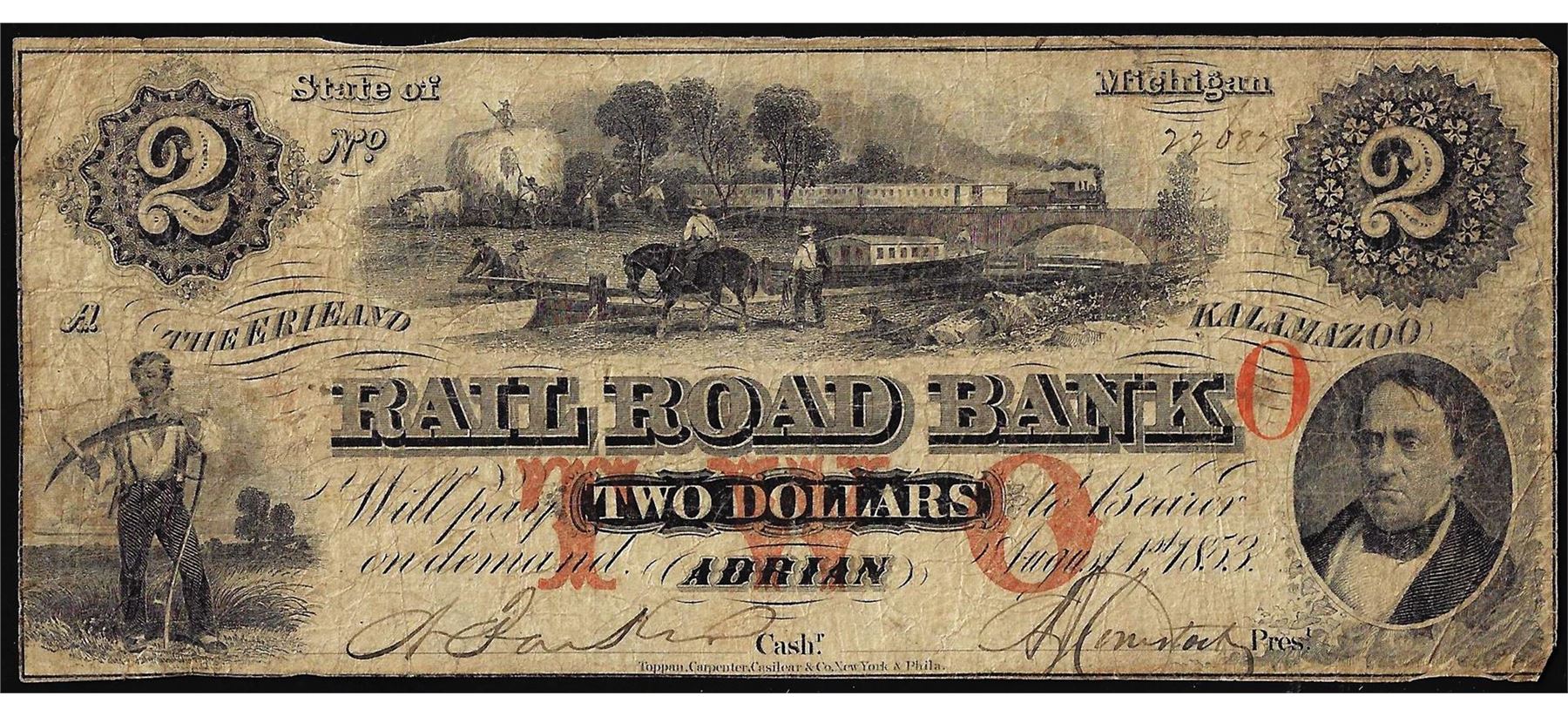 1853 $2 Railroad Bank Adrian, Michigan Obsolete Note