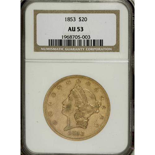 1853 $20 AU53 NGC. Breen-7160. The 3 in the date is li
