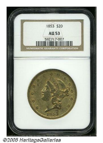 <B>1853<$20> AU53 NGC.</B></I> Sharply struck with some of the original prooflikeness still remaining in the fields. A generally scuffy appearance, on both sides.