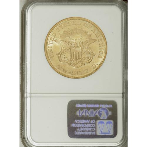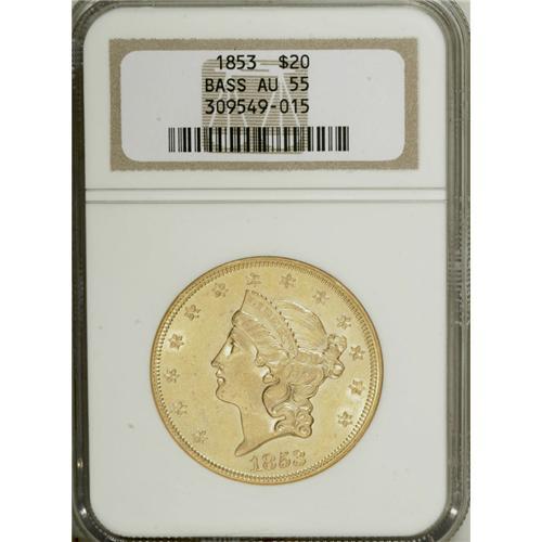 <B>1853 $20 AU55 NGC.</B></I> Ex: Bass. This highly lustrous wheat-gold example has occasional lemon-yellow accents. Well-defined and immensely appealing despite a handful of abrasions and minor highpoint wear.<BR><BR><b>Shipping:</b> Coins & Currency (<a target="_blank" href="http://www.heritageauctions.com/common/shipping.php">view shipping information</a>)