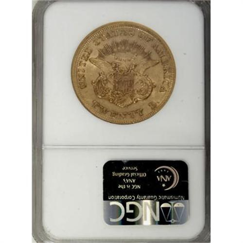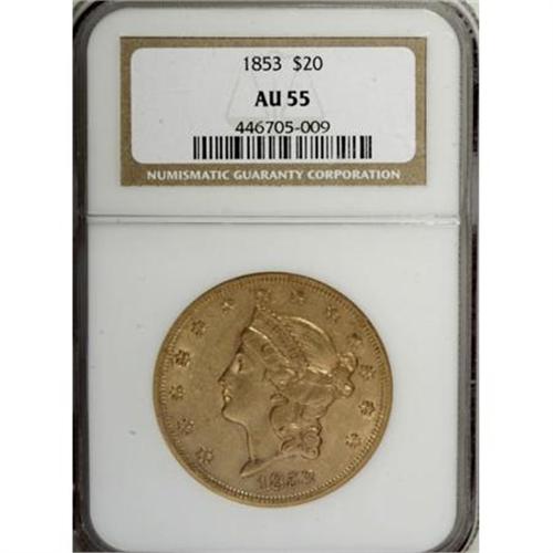 <B>1853 $20 AU55 NGC.</B></I> The 3 in the date is repunched. A luminous, lightly worn yellow-orange representative of this earlier double eagle issue, well struck with light, scattered marks on and around the portrait. Doubling is present at the inner lower curve of the 3 in the date.<BR><BR><B>Coin Engraver:</B> James B. Longacre<BR><BR><b>Shipping:</b> Coins & Currency (<a target="_blank" href="http://www.heritageauctions.com/common/shipping.php">view shipping information</a>)