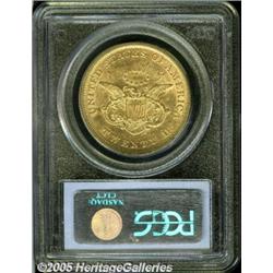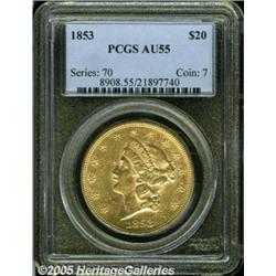 <B>1853 $20 AU55 PCGS.</B></I> Luster outlines all protected areas, and this crisply struck early date double eagle is clean, save for a vertical mark on the jaw.