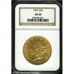 <B>1853 $20 AU58 NGC.</B></I> An attractive Type One Liberty Double Eagle with gleaming surfaces and well struck devices. One of the more available dates for the type and yet still difficult to locate in Mint State.<BR><I>From The Richard J. Chouinard Collection of United States Coins, Part Two.</B></I> Lot:8940