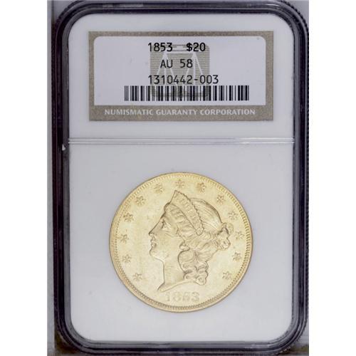 1853 $20 AU58 NGC. The 1853, with a mintage of over 1.