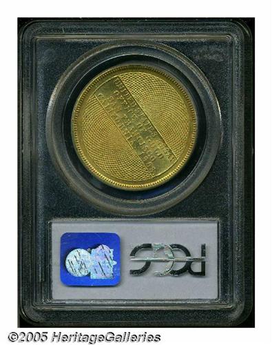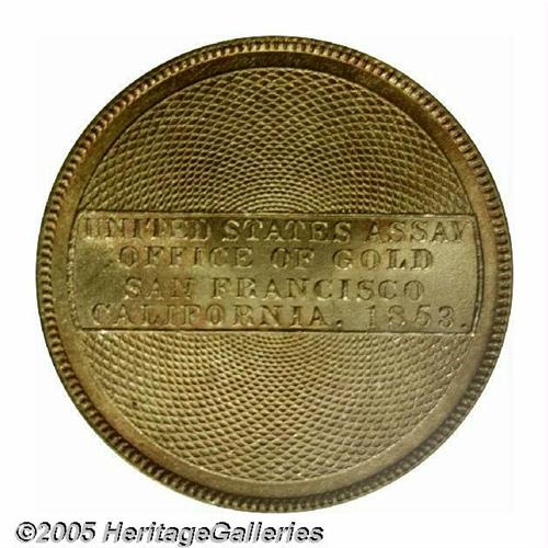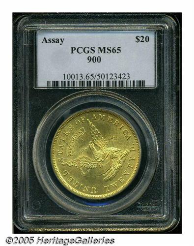 <B>1853<$20> Assay Office Twenty Dollar, 900 Thous. MS65 PCGS.</B></I> K-18, R.2. The San Francisco Mint did not strike coins until 1854, but the booming west coast economy was in dire need of gold coinage as early as 1849, the beginning of the most famous gold rush in American history. In 1851, the U.S. Assay Office in California became a semi-official U.S. mint, led by U.S. Assayer Augustus Humbert, who operated out of the facilities of Moffat & Co. Production was limited to $10, $20, and $50 pieces. The largest production of the U.S. Assay Office occurred in 1853. According to Don Kagin as written in his 1981 standard reference <I>Private Gold Coins and Patterns of the United States,</B></I> more than 2 million Twenty Dollar pieces were produced in 1853, most of which were 0.900 fine. Kagin also states that one piece exists "without crossbar on A's in AMERICA." Perhaps he was referring to the present high grade example, which does not have the crossbar on those two A's, although one exists for the A in STATES. Most examples of Kagin-18 show traces of 88 underdigits in the fineness, however, the present coin does not have this feature, which suggests that it was struck from one of the last obverse dies produced by the Assay Office.<BR>While Assay Office Twenties are not great rarities, by the standards of Territorial Gold, most are not well preserved. They were needed in circulation, where they promptly received edge bruises, scratches, and wear. The majority were eventually melted after the San Francisco Mint commenced operation. Among the small quantity of Uncirculated survivors, most pieces show abrasions from indifferent production and storage. The present Gem is not immaculate, but contact is minimal and of little consequence. The strike is intricate, and the eye appeal is exceptional for the type. Listed on page 299 of the 2005 <I>Guide Book.</B></I> Population: 4 in 65, 0 finer (4/05).