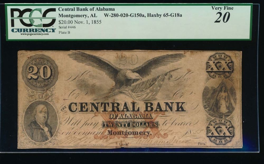 One 1853 $20 Central Bank of Alabama Obsolete Note PCGS 20.