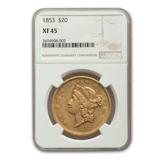 One piece 1853 $20 Liberty Gold Double Eagle XF-45 NGC