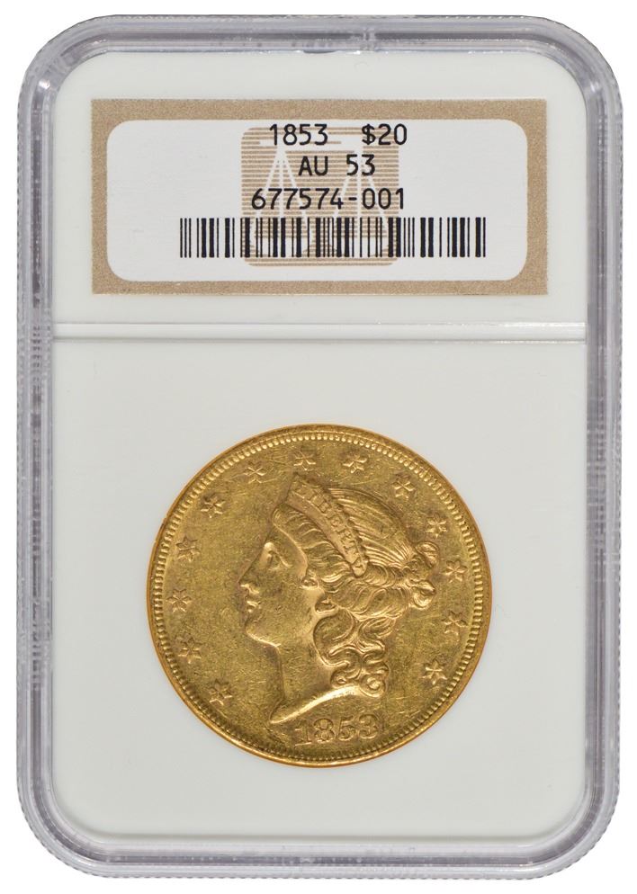 One 1853 $20 Liberty Head Double Eagle Gold Coin NGC AU53.