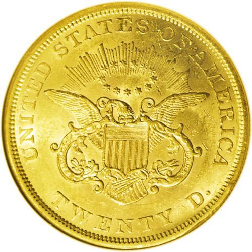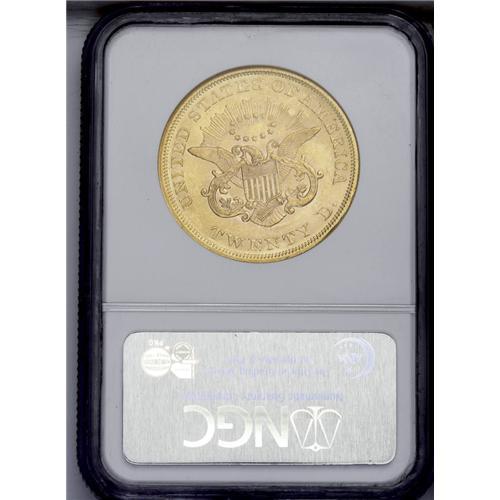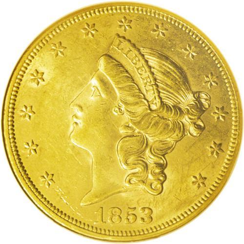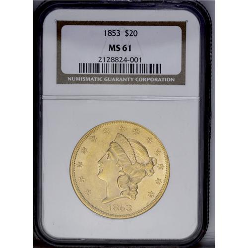 <B>1853<$20> MS61 NGC.</B></I> An intricately struck double eagle with pleasing reverse luster and suitable obverse luster. The surfaces are nearly problem-free aside from moderate reverse rim roughness near 4:30. This issue pre-dated the various shipwreck hoards, and in Mint State, was little represented among them. Census: 23 in 61, 17 finer (9/06).