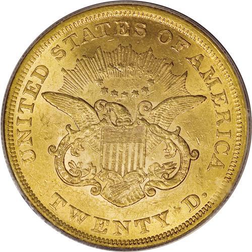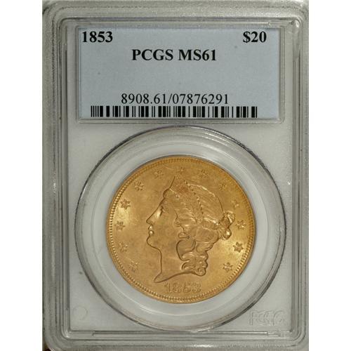 <B>1853 $20 MS61 PCGS.</B></I> Between a relatively low mintage of slightly over 1.26 million examples and moderate demand for circulation, Mint State pieces are elusive today. This well struck orange-gold representative displays strong luster and no trace of wear. Scattered abrasions and a trio of reed marks on the cheek define the grade. Population: 8 in 61, 18 finer (4/07).<BR><BR><b>Shipping:</b> Coins & Currency (<a target="_blank" href="http://www.heritageauctions.com/common/shipping.php">view shipping information</a>)