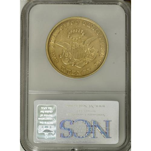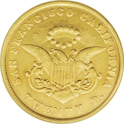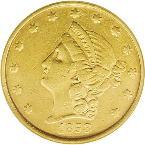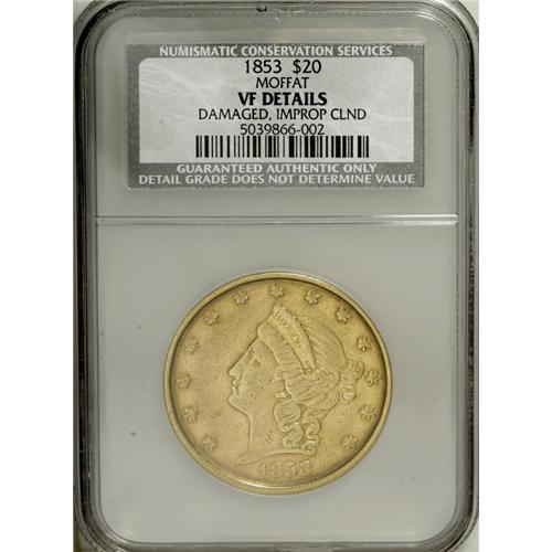 <B>1853 $20 Moffat & Co. Twenty Dollar--Damaged, Improperly Cleaned--NCS. VF Details.</B></I> K-19, High R.5. No damage or repair is readily evident, although the olive-gold surfaces are bright from cleaning. The reason for the 1853 Moffat issue is unknown, since the Assay Office, under the supervision of Moffat partners, struck twenty dollar pieces in considerable quantity that year. Listed on page 352 of the 2007 <I>Guide Book.</B></I><BR><BR><b>Shipping:</b> Coin/Currency (<a target="_blank" href="http://www.heritageauctions.com/common/shipping.php">view shipping information</a>)