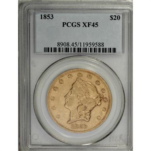 <B>1853 $20 XF45 PCGS.</B></I> Not the famous 1853/2 variety, but the 3 is nicely recut. Luster illuminates the hair, stars, wings, rays, and legends. Inoffensively abraded and evenly worn.<BR><BR><B>Coin Engraver:</B> James B. Longacre<BR><BR><b>Shipping:</b> Coins & Currency (<a target="_blank" href="http://www.heritageauctions.com/common/shipping.php">view shipping information</a>)