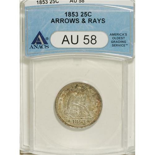 <B>1853 25C Arrows and Rays AU58 ANACS.</B></I> NGC Census: (194/682). PCGS Population (72/287). Mintage: 15,210,020. Numismedia Wsl. Price for NGC/PCGS coin in AU58: $442. (#5426)<BR><BR><b>Shipping:</b> Coins & Currency (<a target="_blank" href="http://www.heritageauctions.com/common/shipping.php">view shipping information</a>)